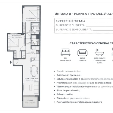 68 m2 totales, 62 m2 cubiertos, 6m2 balcón